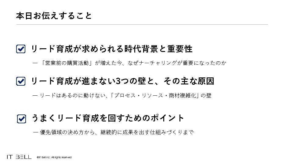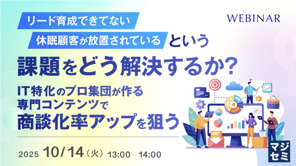 本セミナーでは、IT業界に特化したマーケティングのプロ集団が、いかにしてリードの関心度を高めたコンテンツで成果を最大化するか、商談化率アップを見据えた戦略的なリードナーチャリングの手法とコンテンツ制作についてご紹介します。