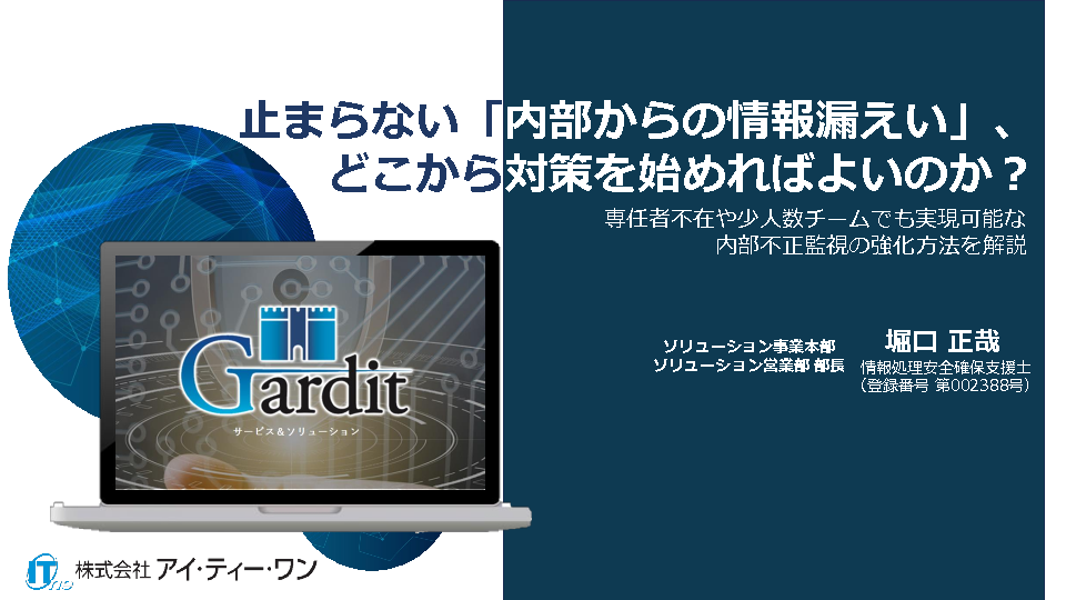 本セミナーでは、セキュリティ強化を阻む運用課題を整理するとともに、その解決策として、今すぐ実践できる内部からの情報漏えい対策クラウドサービス「Gardit」を提案します。サービスの特徴や機能を解説するとともに、どのように日々の挙動監視や監視・レポーティングなどの運用サイクルで活用されているのかを導入事例を交えてご紹介します。同サービスが高く評価されている理由、豊富な実績を持つ理由や、監視エージェントの導入のみでクイックに運用開始できる特長やサーバー導入・運用が不要であるなどのメリットも解説します。