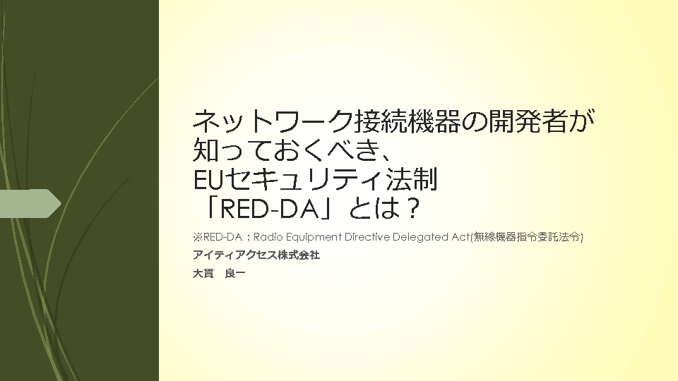 10:05~10:40 ネットワーク接続機器の開発者が知っておくべき、EUセキュリティ法制「RED-DA」とは? ~「CRA」「IEC 62443-4-2」「ETSI EN 303 645」との関連を解説~