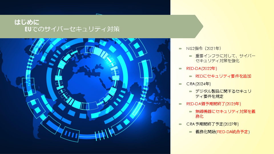 また、2024年中に「Cyber Resilience Act(CRA)」が発効予定となっており、無線機器だけではなく直接および間接的にネットワークにつながる電子デバイスのほとんどが対象となることが示されています。