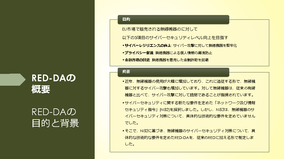 こうした状況の中、欧州ではIoT機器や産業制御システムを含む無線機器に「RED(Radio Equipment Directive:欧州無線機器指令)」のサイバーセキュリティ要求を実行する方針が打ち出されています。2024年8月からEU市場で販売される対象の無線機器については「無線機器指令委託法令(RED-DA)」に基づいた様々な要件を満たす必要があります。