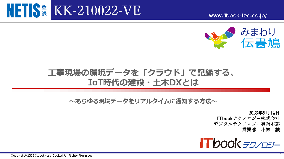 本セミナーでは建設・土木の環境センシングIoTサービス「みまわり伝書鳩」を用いた、工事現場の様々な環境データをリアルタイムにモニタリングし、視覚や音声で通知する具体的な方法について解説いたします。