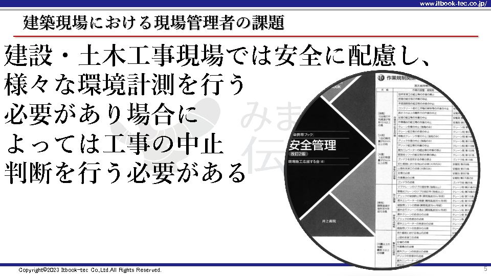 作業員の安全対策や工程管理の体制の整備のため、現場の気象環境のモニタリングをより強化する事が重要です。
