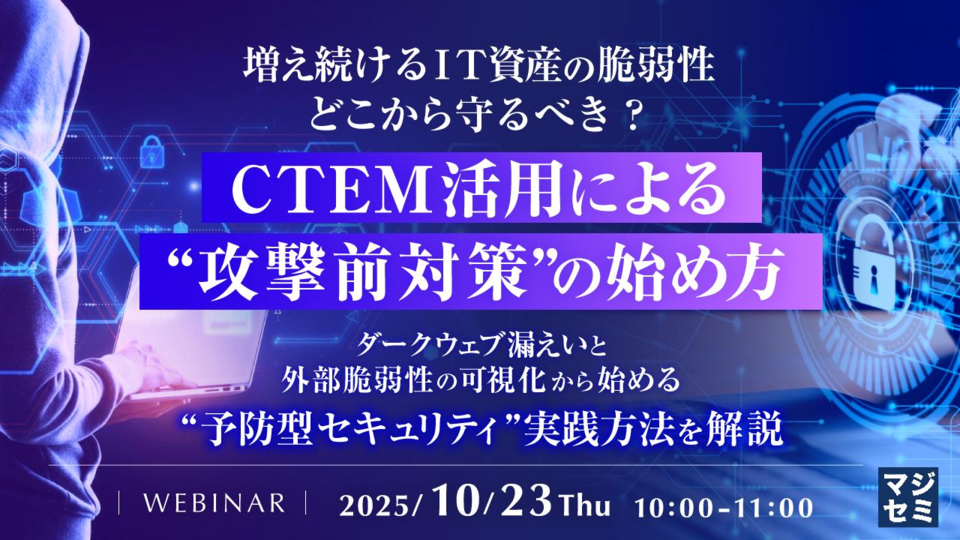増え続けるIT資産の脆弱性、どこから守るべき?CTEM活用による“攻撃前対策”の始め方 ~ダークウェブ漏えいと外部脆弱性の可視化から始める“予防型セキュリティ”実践方法を解説~