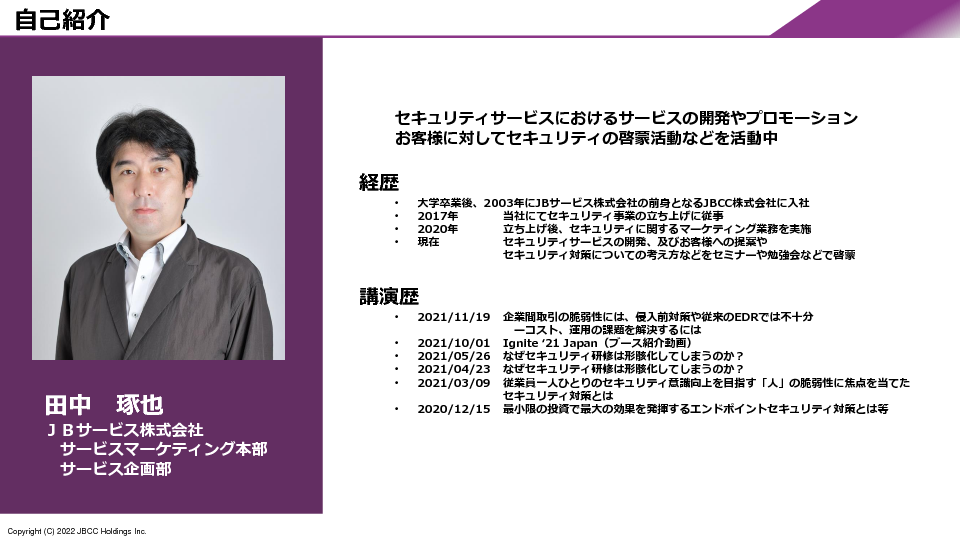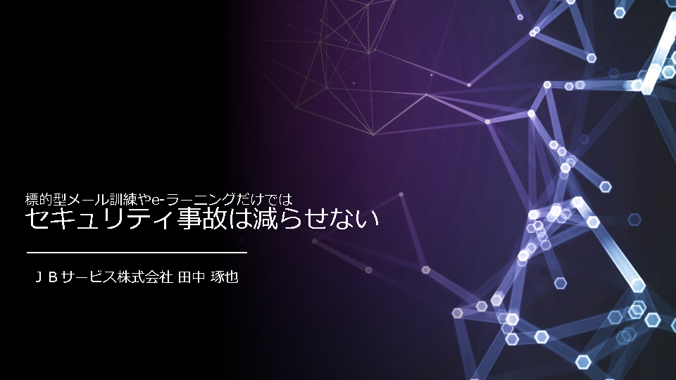 10:05~10:40 標的型メール訓練やe-ラーニングだけではセキュリティ事故は減らせない〜社内に「セキュリティ意識向上層」を育成して、セキュリティインシデントを発生させない新しい教育アプローチ〜(JBサービス)