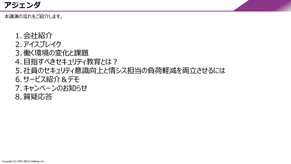 本セミナーでは、セキュリティ責任者・管理職の方向けに、近年のサイバーリスクをとりまく環境とセキュリティ教育の課題を解説しながら、JBサービスが提供するSecuLiteracy(セキュリテラシー)の事例を交えながらご紹介いたします。
