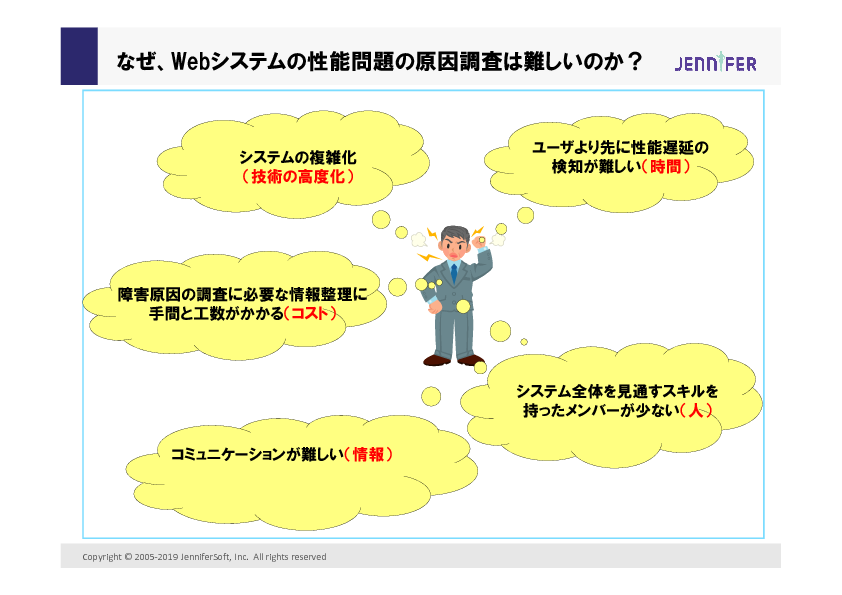 本セミナーでは、なぜ、Webシステムの性能問題の原因調査は難しいのか、その理由を解説するとともに、性能低下の原因が3クリックでわかる、国内導入実績No.1アプリケーション性能管理(APM)ツール「JENNIFER」を紹介します。