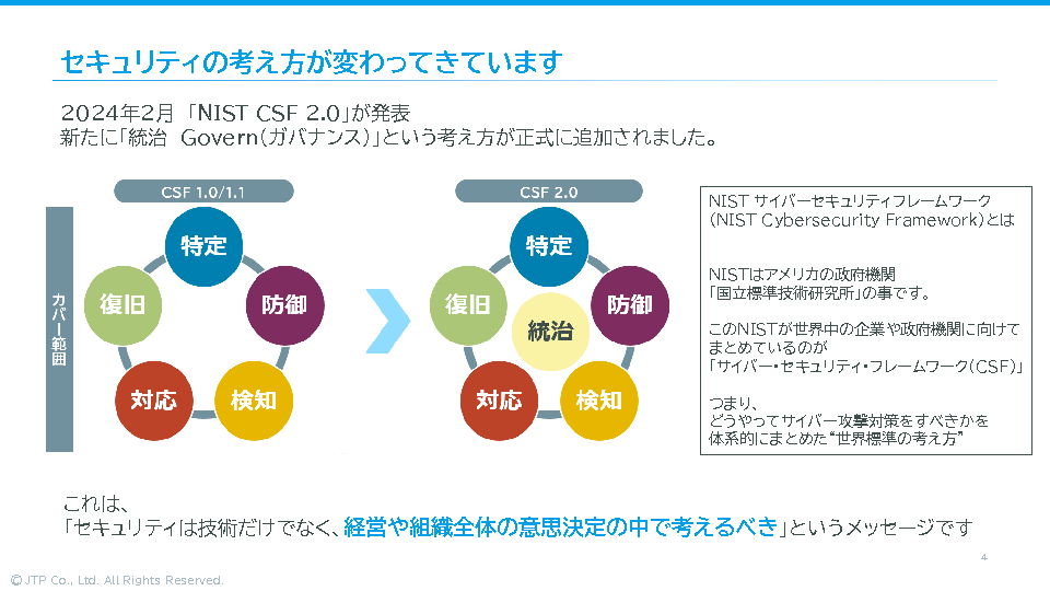さらに、JTPのセキュリティ規程策定支援サービスでは、この診断を起点に「現状把握 → 問題整理 → 規程策定 → 展開・定着」までを一貫して伴走支援します。情報セキュリティ分野で権威がある国際資格の一つであるCISSP資格をもつ、JTPのセキュリティコンサルタントが、ISO・NIST・IPAガイドラインなどの公的基準を参照し、実効性の高い規程作成と社内教育までサポートします。