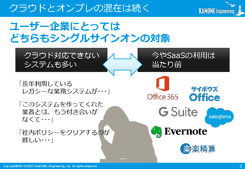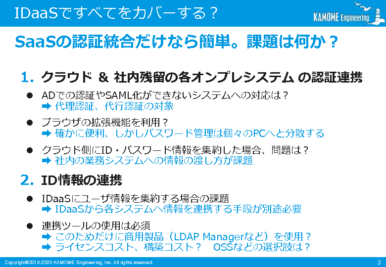 IDaaSを活用する選択肢もありますが、その際にオンプレ環境に残った社内システムとどう連携するかについては悩ましい課題です。
