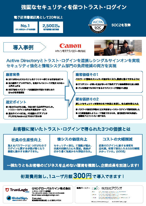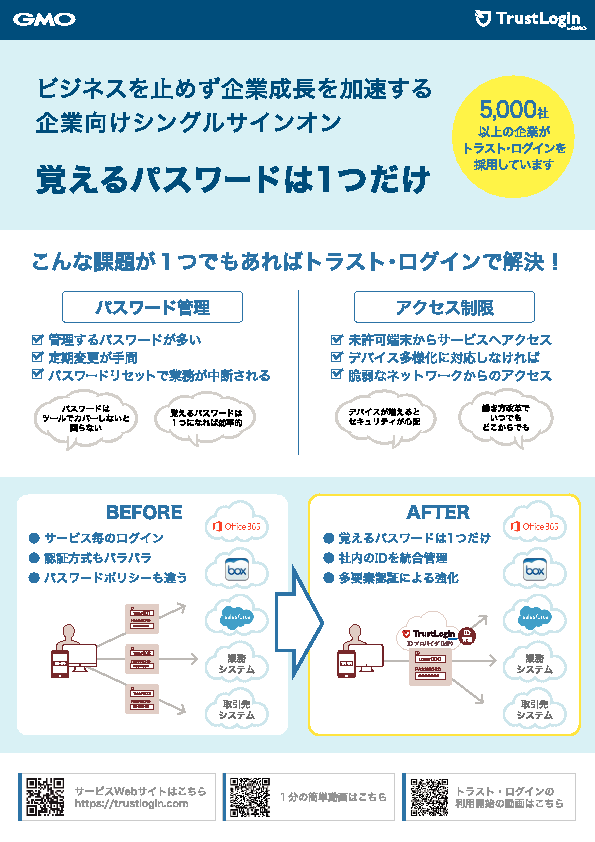 「トラスト・ログイン by GMO」はWebサービスごとにある複数のログイン情報を”ひとつにおまとめ”できる クラウド型シングルサインオンサービスです。ログイン情報をひとつにすることで、ログイン情報の紛失や、 複数サービスでのパスワードの使い回しを防げます。セミナーではデモンストレーションを交えてシングルサインオンについてご紹介します。
