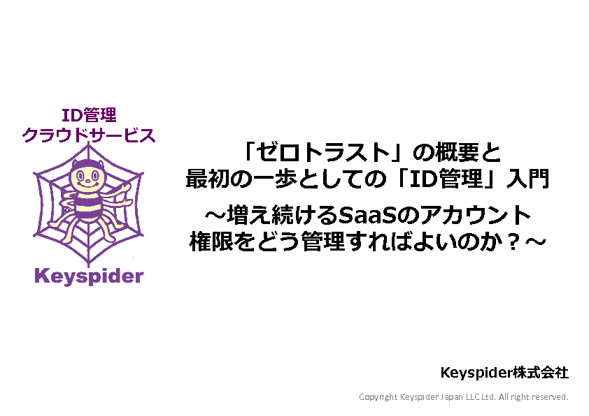 本セミナーでは、「ゼロトラスト」導入の第一歩とされている「IDライフサイクル管理」について、分かり易く解説するとともに、ID管理を簡単に実現する、「ID管理クラウドサービス Keyspider」についてご紹介します。