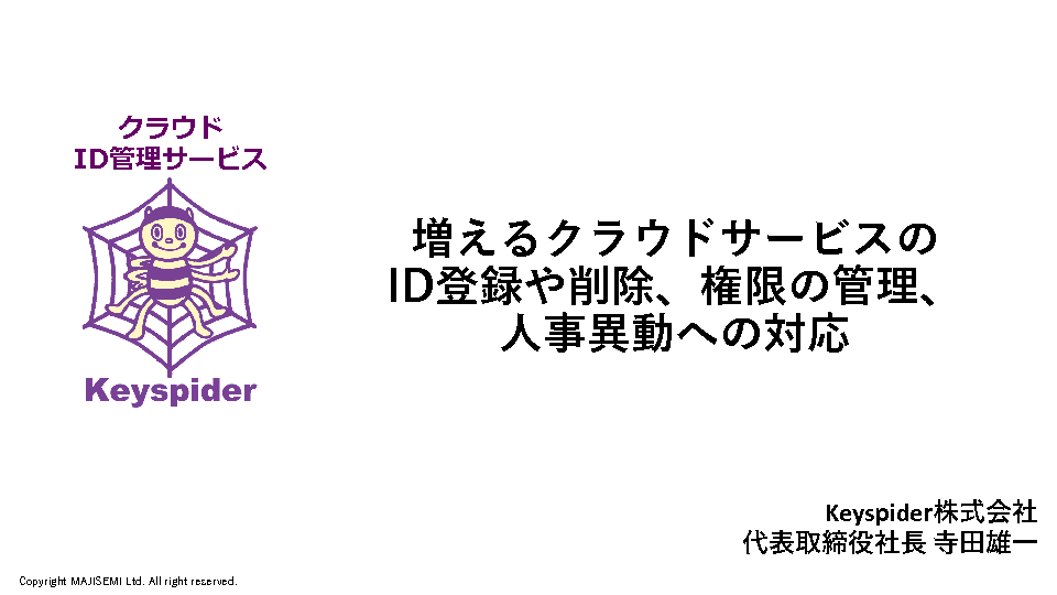 また、従業員のユーザーIDや権限を統合管理し、全てのSaaSと社内システムに同期するクラウドID管理サービス Keyspider をご紹介し、クラウドサービスのID登録や削除、権限の管理、人事異動への対応について解説します。