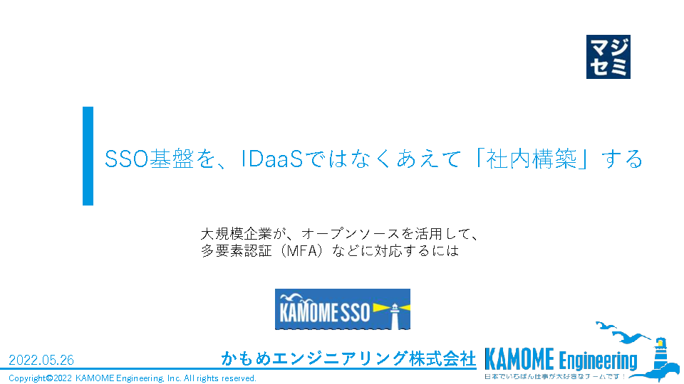 本セミナーでは、国内の大手企業向けに、オープンソースのKeycloakを活用したSSO基盤を多数構築してきたかもめエンジニアリングが、Salesforce多要素認証必須化や、Microsoft365、BOXなどとのシングルサインオンにも対応できる認証基盤の構築事例や、大手企業にとってのコストメリット、IDaaSとのメリット/デメリットなどについて解説します。