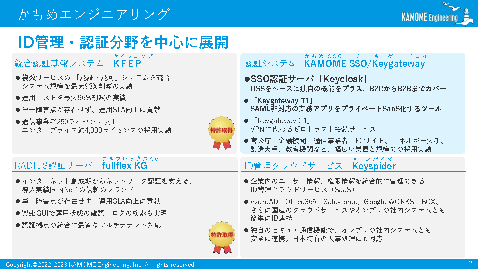 本セミナーでは、国内の大手企業向けに認証基盤を多数構築してきたかもめエンジニアリングが、多要素認証やMicrosoft365、BOXなどとのSSOにも対応できる認証基盤システム「KAMOME SSO」の構築事例についてご紹介します。