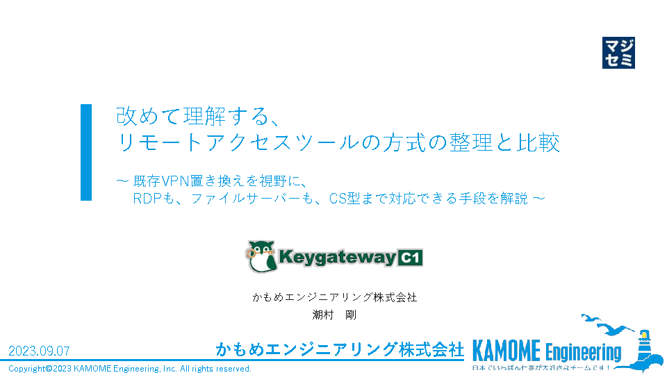 11:05~11:45 改めて理解する、リモートアクセスツールの方式の整理と比較 ~既存VPN置き換えを視野に、RDPも、ファイルサーバーも、C/S型まで対応できる手段を解説~