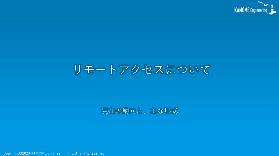本セミナーでは、改めてリモートアクセスツールの方式について整理をした上で、それぞれの方式を比較します。