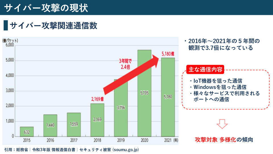 データの漏洩はもちろん、不正アクセスやサイバー攻撃の対象となることが考えられます。