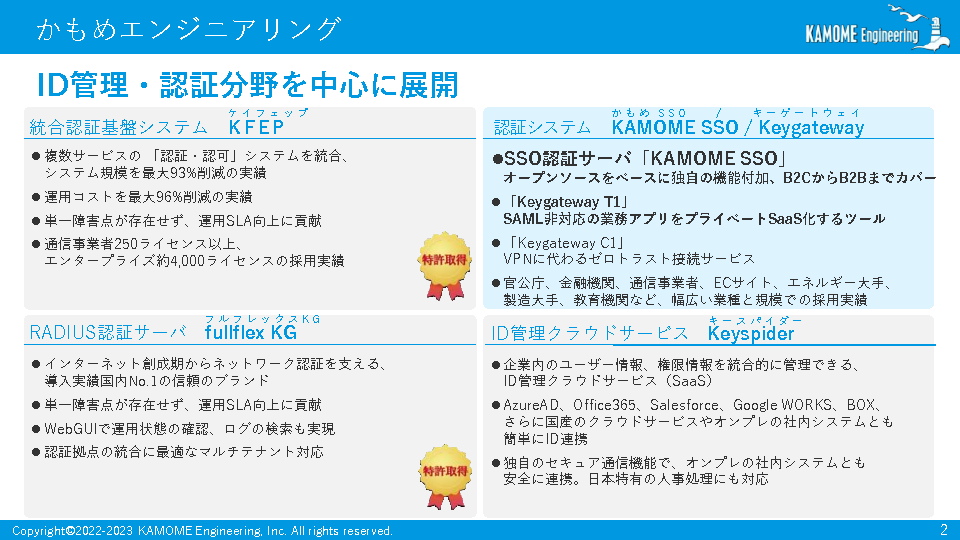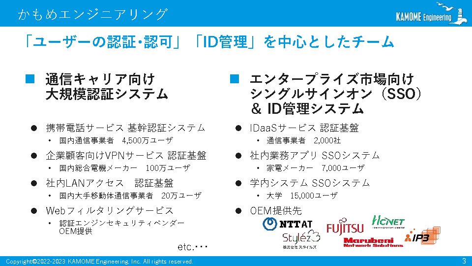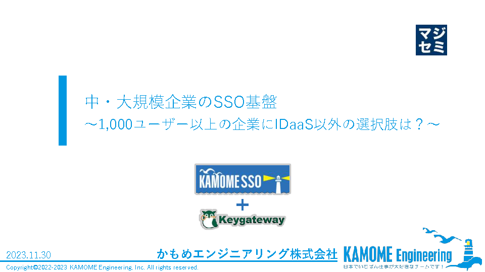 本セミナーでは、国内の大手企業向けに認証基盤を多数構築してきたかもめエンジニアリングが、多要素認証やMicrosoft365、BOXなどとのSSOにも対応できる認証基盤システム「KAMOME SSO」の構築事例についてご紹介します。
