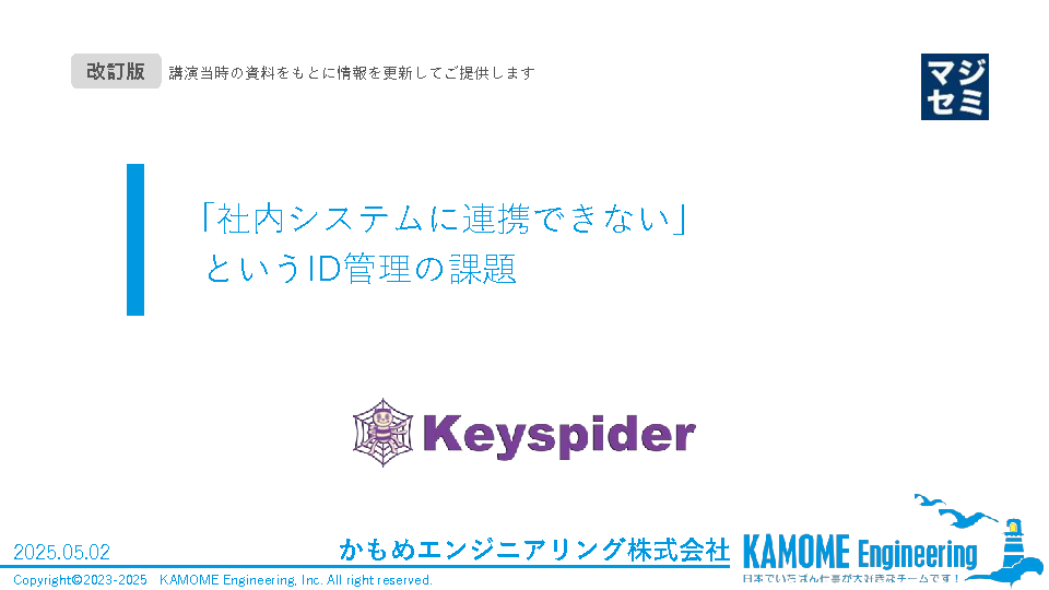 本セミナーでは、上記のようなID管理を取り巻く状況や課題について解説するとともにオンプレやスクラッチのシステムとも連携できる、国産クラウドID管理サービス「Keyspider」についてご紹介いたします。