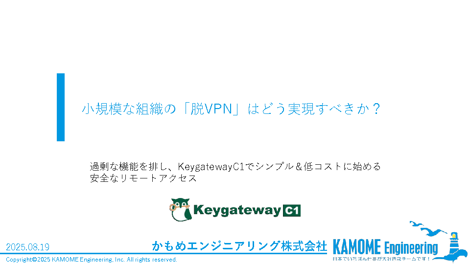 15:05~15:45 小規模な組織の「脱VPN」はどう実現すべきか? ~ 過剰な機能を排し、KeygatewayC1でシンプル&低コストに始める安全なリモートアクセス ~