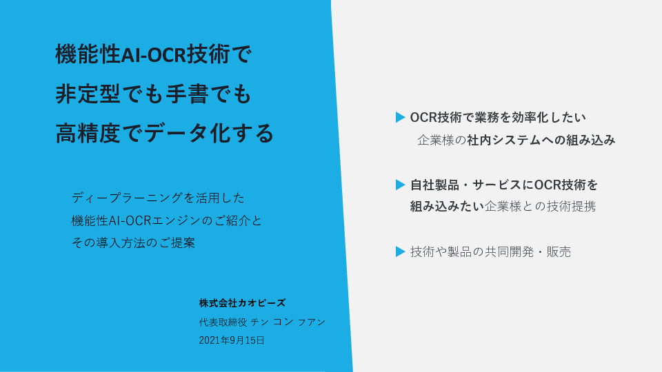 そこで本セミナーでは、ディープラーニングを活用した技術により様々なフォーマットの書類を高い精度で読み取ることができ、なおかつ手書きと活字の両方に対応している機能性AI-OCRについて紹介します。