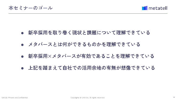 本セミナーでは、そうした採用広報の限界を打破する新たなアプローチとして、法人向けメタバースプラットフォーム「metatell(メタテル)」を活用した体験型採用手法をご紹介します。スキャン不要・既存素材のみで構築可能な3D空間を用い、学生に“働くリアル”をオンライン上で直感的に伝える方法とは? 実際の活用事例や導入の流れも交えて、採用現場での活用イメージを具体的にお伝えします。「見せる」「体験させる」採用広報が、他社との差別化や志望度アップにどうつながるのかを掴んでいただける内容です。