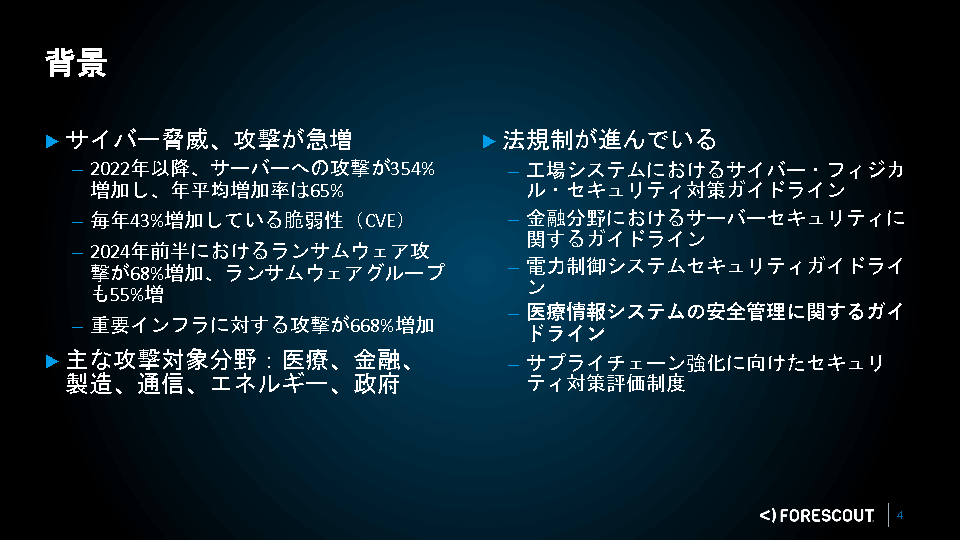 近年、クラウド技術と通信インフラの進化に伴い、OT環境やIoTデバイスとITの融合が急速に進み、ネットワークに接続されるデバイスの種類と数が急増しています。しかし、サイバー攻撃が高度化する中で、セキュリティ対策が手薄なこれらのデバイスが新たな攻撃の標的となるケースが増加しています。