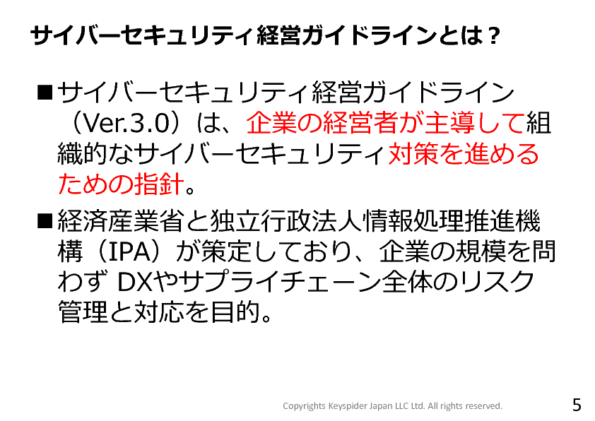 本セミナーでは、まず経産省サイバーセキュリティ経営ガイドラインについて、ID管理、IT統制の部分を中心に解説。ガイドラインが求める統制レベルを現実的に満たすためには、人事情報と連動したアカウント生成や、異動・退職に合わせた権限更新、委託先を含むユーザー管理を自動化できる基盤が不可欠であることを示します。