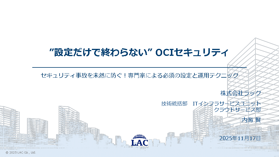 本セミナーでは、まずオラクル社よりOCI市場の最新動向やクラウド利用におけるセキュリティ確保の必然性をご紹介いただきます。続いて、国内で多くの企業のセキュリティ課題に取り組んできたラックが登壇し、OCIにおける「設定の見落としやすさ」「過剰権限」といったリスクを、予防・検知・復旧の三層構えで“一気通貫”に解決するアプローチをご説明します。標準メニューを活用した短期導入の具体像を提示し、OCI利用のはじめの一歩として“安心できるセキュリティ基盤”を実装する道筋を明確にお伝えします。