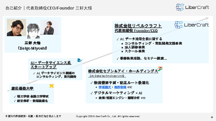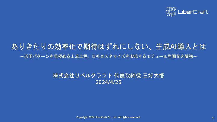 今回のセミナーではAI活用に関する書籍の執筆なども手がけるリベルクラフトの三好代表が生成AIおよびAI活用の基本、自社開発を成功させる秘訣などを解説します。