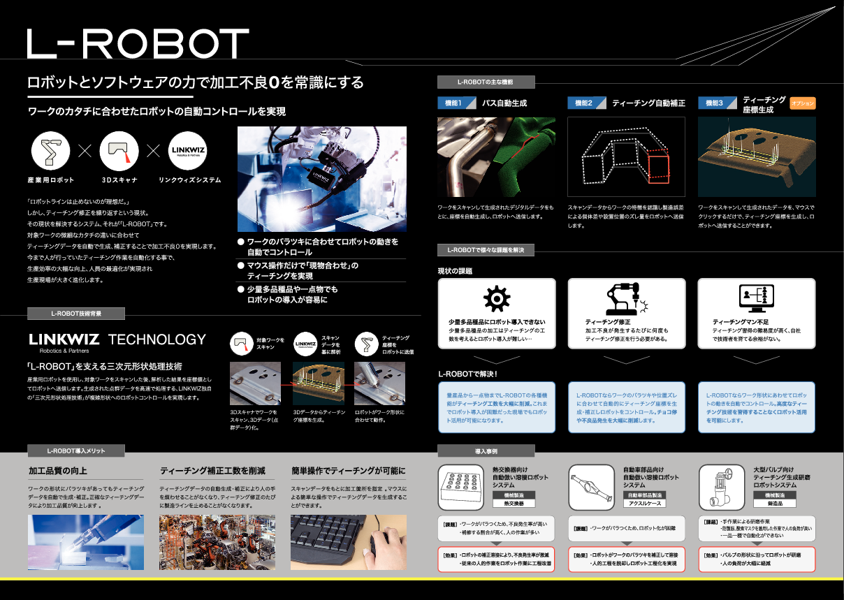スキャナーを溶接のロボットに導入するだけで、ティーチング時間が大幅に短縮できるため、多品種少量生産でも溶接の自動化が実現でき、生産性の向上にも寄与できます。