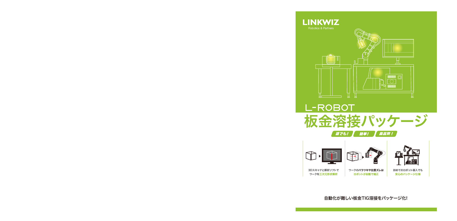『L-ROBOT』は、事前にロボットが対象ワークをスキャンし、LINKWIZ独自の「三次元形状処理技術」を用いて、溶接パスを自動で生成することが可能です。これにより、専用治具が不要となり、さらにティーチング作業も必要なく、ロボットがワークの形状や位置ズレに対応できるようになります。