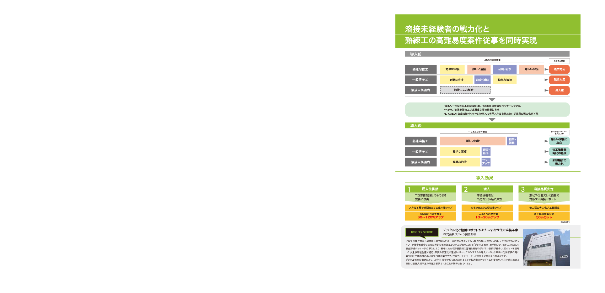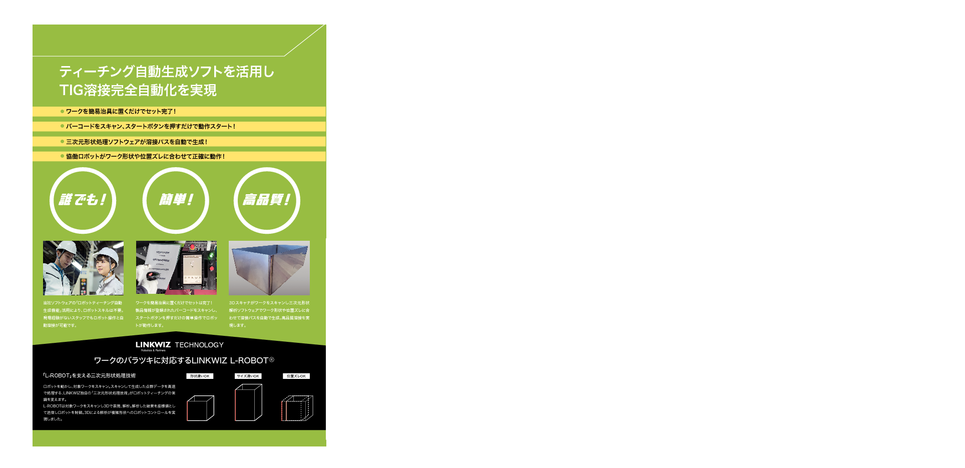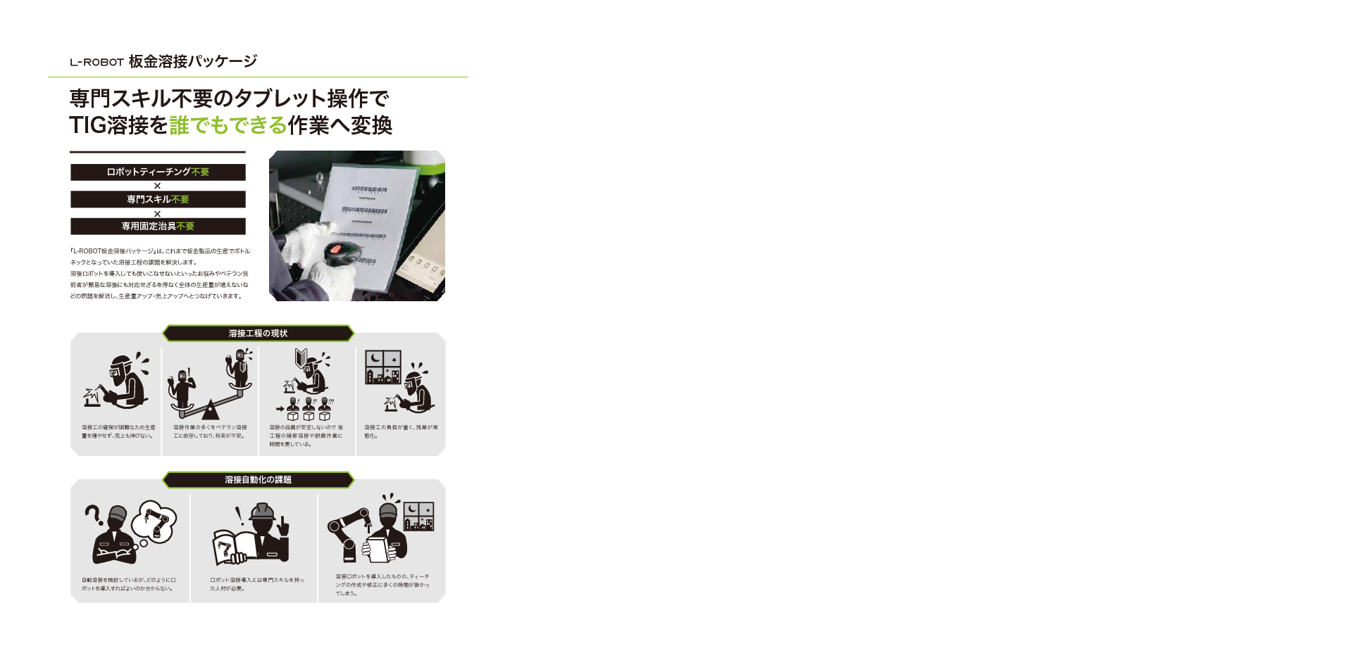 本セミナーでは、ロボットのティーチング作業の自動化を実現する『L-ROBOT』の技術を通して、従来自動化が困難であったTIG溶接の自動化に焦点を当てて事例と共に詳しく説明します。