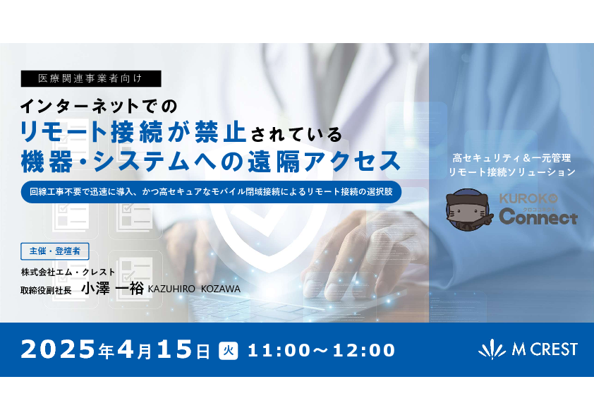モバイル閉域接続をうまく活用することで、インターネット接続が許されない環境でも、コストを抑えつつ高いセキュリティレベルを保つリモート接続を、迅速に導入することができます。これにより、厳格なセキュリ対策が求められる医療施設内の機器やシステムに、遠隔による安全な運用・保守が可能となります。本セミナーでは、モバイル閉域接続を活用したリモート接続の利点や導入方法を詳しく解説し、医療施設内の機器やシステムへのセキュアで効率的な運用・保守を実現するための選択肢を提供します。