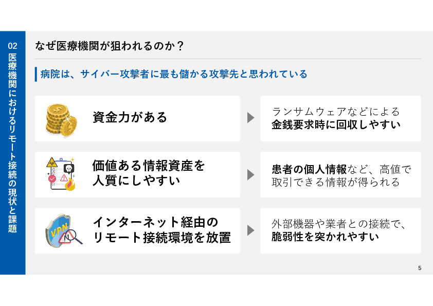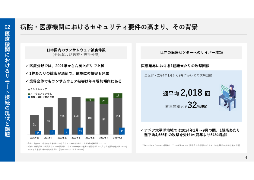 病院内の機器やシステムは、患者の個人情報や医療データを保護するために厳格なセキュリティ対策が求められています。特に近年ではリモート接続による脆弱性を突いたサイバー攻撃が急増しており、多くの医療施設では機器やシステムの保守/メンテナンス時等のリモート接続において、インターネット接続を原則禁止にすることが一般的となってきました。そのため、医療機器の運用や保守、トラブルシューティングを遠隔で実施する際に課題となっています。