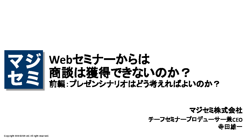 今回は、参加者に興味を持ってもらうにはどうすればよいのか、どうすれば商談に繋がるプレゼンができるのか、以下の内容について、マジセミ代表 寺田雄一が解説します。