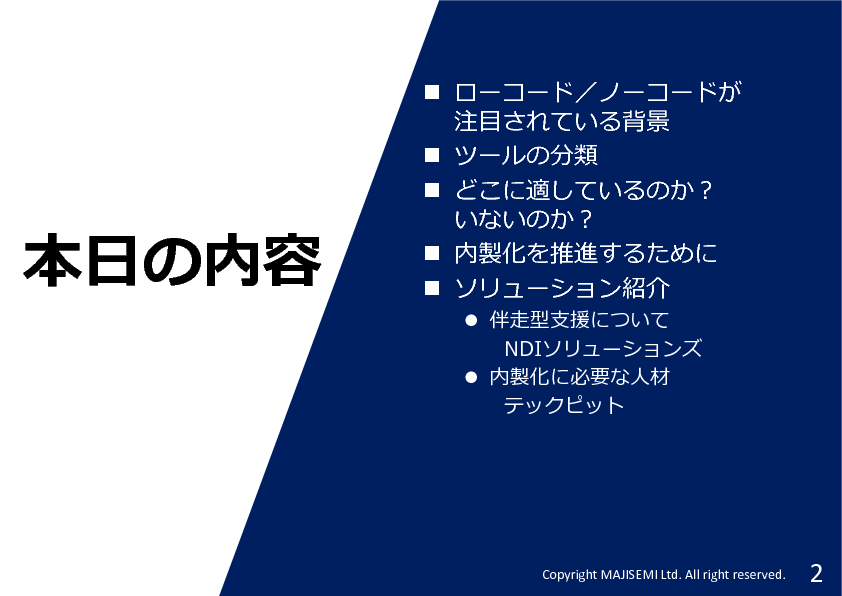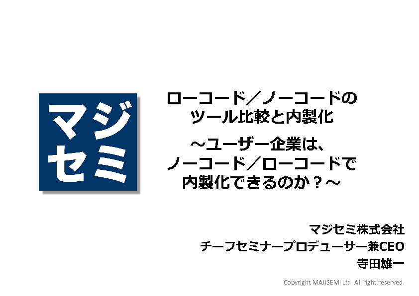 本セミナーでは、7月に実施したマジセミの対談セミナーの内容も踏まえながら、ローコード、ノーコードツールの課題や内製化の課題について解説します。https://majisemi.com/e/c/ossbusiness-20220726/M1A