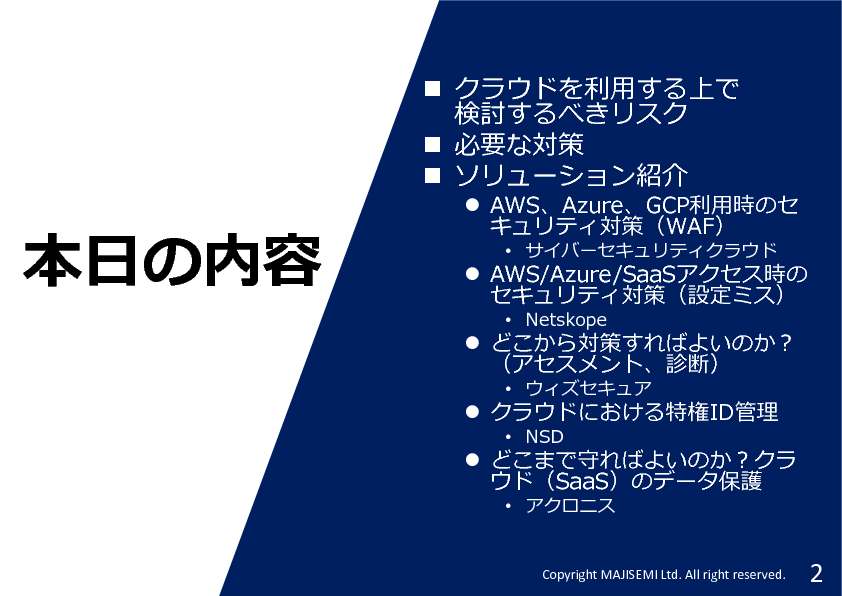 本セッションではクラウド利用時の考慮すべきポイントと安心してご利用いただけるためのソリューションを解説します。