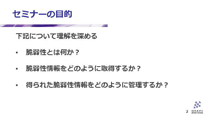 本セミナーではまず、「いまさら聞けない脆弱性管理入門」として、以下の内容について入門解説します。