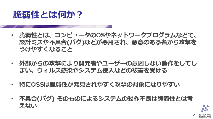 これらは悪意のある者に悪用され、情報漏洩、データ改ざん、サービス運用停止といったセキュリティインシデントを引き起こす可能性があります。