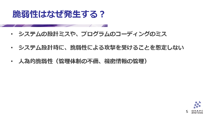 脆弱性はソフトウェアのバグや設定の不備など、様々な要因により生じます。