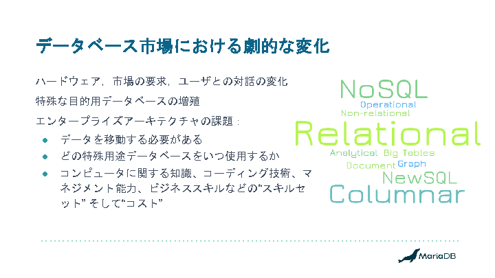 しかしどのように選択すればよいのでしょうか。MySQL、PostgreSQLなど種類はいくつかありますが、近年多方面においてMariaDBのシェアが急速に広まっています。