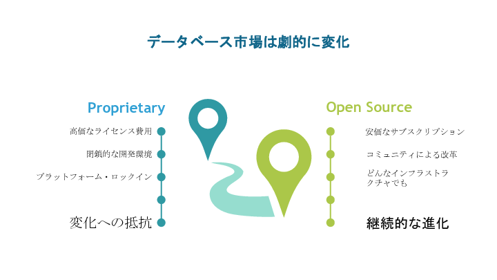 近年、Oracle等の商用製品からOSSデータベースに移行する動きが活発化しています。近年のOSSDBは、商用DBに匹敵する基本機能や性能を備えつつあります。OSSDBはコスト削減やベンダーロックインの回避など、メリットが多い反面、移行や導入コスト、性能などの不安要素もあります。そこで各種データベースのメリット・デメリットを生かした選択をすることが大変重要になってきます。