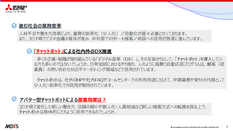 チャットボットは、社内FAQやコールセンターでの利用用途に加えて、窓口業務や受付の代替として省人化・効率化での活用が期待されています。