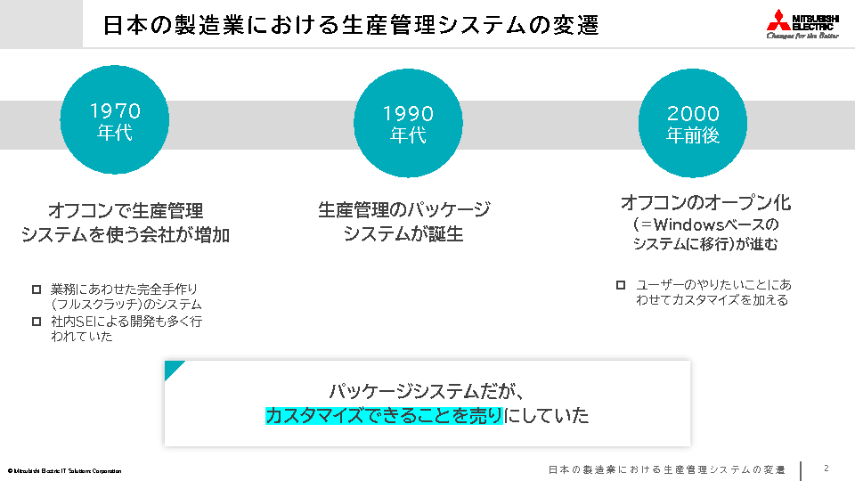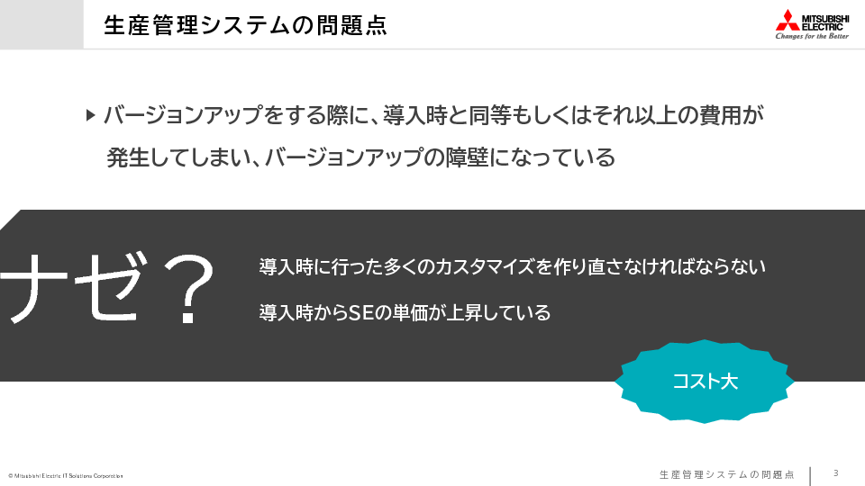 特に、日本の製造業は、モノづくりにおける独自の精神性と細かな作業プロセスを強みとしています。そのため、生産管理システムは長年に渡り現場のニーズに即応するため、微細なカスタマイズや段階的な改修を繰り返してきました。しかし、これらボトムアップによる改修は、結果としてシステムが複雑になります。そのためシステムが老朽化した際には、大幅な改善や新システムへの移行が難しくなり、ビジネス環境の急激な変化に対しての競争力の維持が困難になってしまいます。