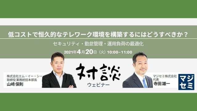 10:00~10:40 【MEC×マジセミ対談】低コストで恒久的なテレワーク環境を構築するにはどうすべきか?〜セキュリティ・勤怠管理・運用負荷の最適化〜