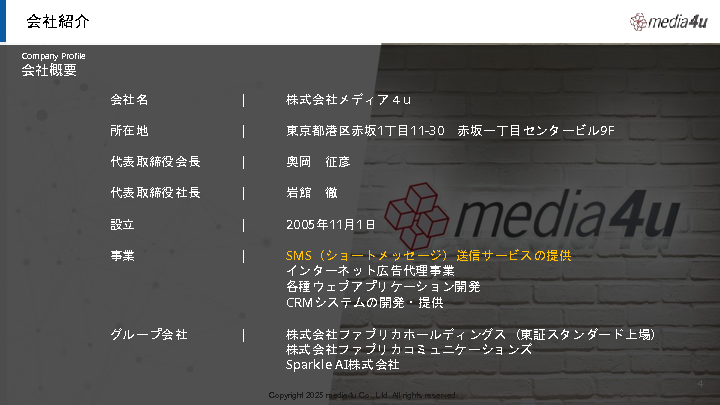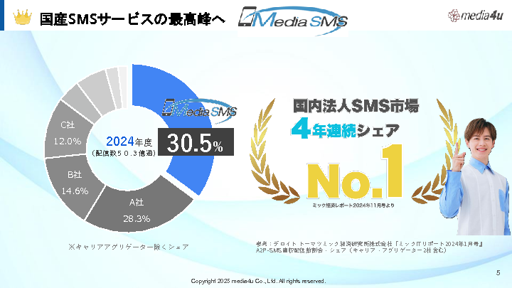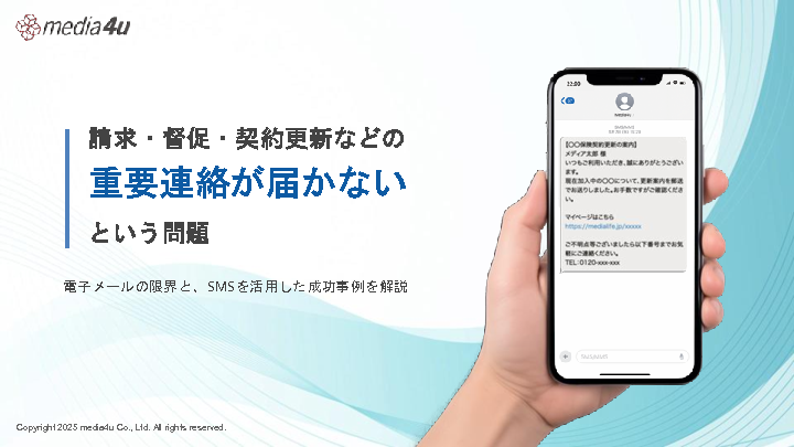本セミナーでは、開封率90%以上を実現するSMSを活用し、重要通知の到達率と反応率を飛躍的に高める方法をご紹介します。特に、「メディアSMS」は大手金融機関や官公庁をはじめとする約6,500社への導入実績を有し、国内法人向けSMS市場で4年連続配信数シェアNo.1という高い信頼性を誇ります。URL付き通知やクリック数の可視化、業務に応じたテンプレート機能など、通知精度と効率を両立する機能も充実。実際の導入企業の成功事例を交えながら、すぐに現場で活かせる通知業務改革のステップを解説します。