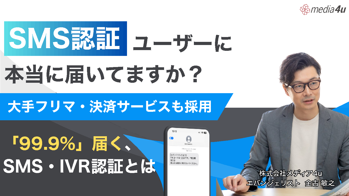 本セミナーでは、日々大量の本人認証が求められる大手フリマアプリやキャッシュレス決済サービスなどで採用され、 4年連続シェアNo.1 を誇る SMS・IVR認証サービス「メディアSMS」 をご紹介します。本サービスは、SMS認証専用に構築された独自インフラ上で稼働しており、国内キャリア直収による 到達率99.9% という圧倒的な信頼性を実現。さらに、電話自動発着信(IVR) にも対応しており、ガラケーや固定電話のみのユーザー層にも確実に認証が届く仕組みを備えています。