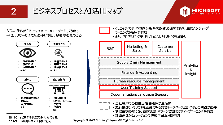 日本では、営業、マーケティング、製品・サービス開発などのさまざまなビジネス分野で、生成AIを含むAI技術の活用が急速に進んでいます。現在、AI技術は幅広い業界に導入されつつあります。
