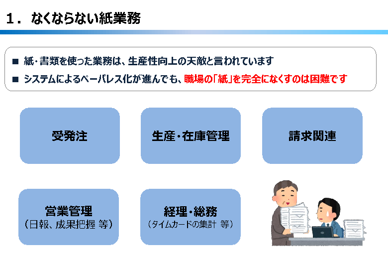 DXの加速と長期化するコロナウイルスの影響で、急速に働き方が変化しています。しかしながら、製造業やバックオフィスなど紙伝票を多く扱う部門では、ペーパーレス化が障壁となることが多く見受けられます。